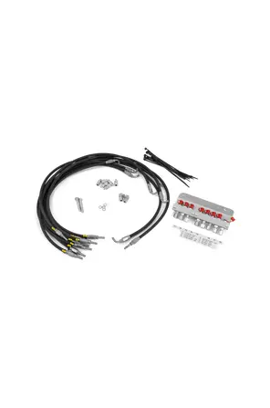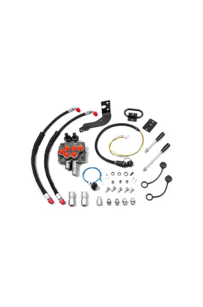 This hydraulic kit is essential for adapting front-mounted attachments with hydraulic functions to various garden tractors. It features two auxiliary hydraulic connections, a valve, a switch, and hoses with connectors and wires, ensuring seamless integration and enhanced functionality. Ideal for users of the P 520DX model and those with P 525DX and P 525DX CABIN, this kit enhances the versatility and performance of your lawn mowing equipment.