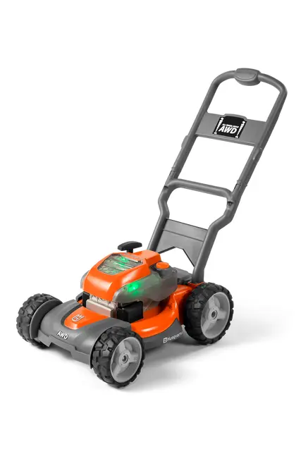 Introducing the Toy Lawn Mower by Husqvarna, a delightful addition to any child's playtime. This battery-operated toy features an active starter, realistic sounds, and flashing lights, making it an engaging and fun experience for kids aged 3 and up. Perfect for encouraging imaginative play, this toy is sure to be a hit!